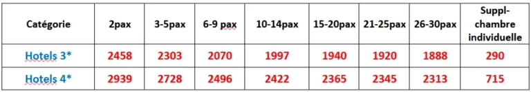 • Hébergements à l’hôtel basé sur une chambre double ou à 2 lits (une chambre partagée pour 2 ou 3 personnes) avec petit-déjeuner compris.